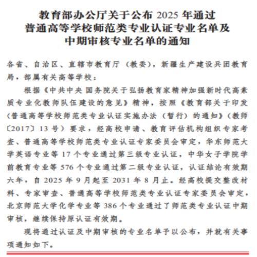 近日,教育部办公厅正式发布了《KY.COM公布2025年通过普通高等学校师范类专业认证名单及中期审核专业名单的通知》。我校学前教育专业在该认证中顺利过关,认证结论有效期为六年。